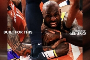 直播吧4月26日讯 今日,湖人官推晒出一张昨日在湖人击败火箭的季后赛首轮G3加时赛中,詹姆斯倒地奋力拼抢球权的海报。