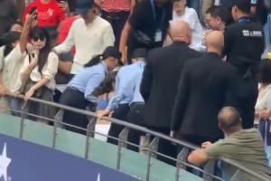 多名民警上前将其控制,她仍在尖叫挣扎,最终被抬出看台。
